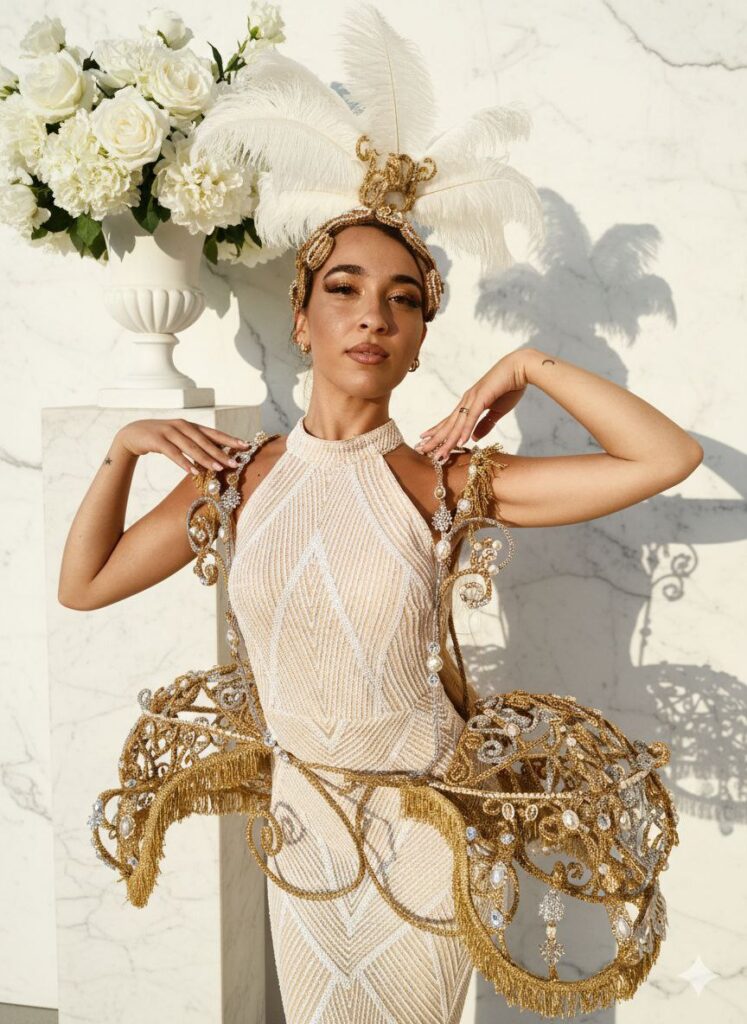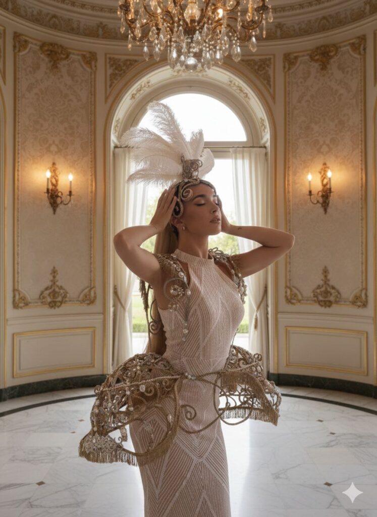 Costumi Scenografici Unici: Disponiamo di un guardaroba esclusivo che spazia dallo stile barocco moderno con strutture metalliche e perle (come il celebre outfit in oro e argento), fino a look futuristici o piumati da cabaret.